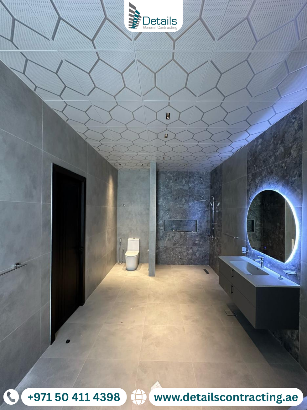Explore our modern kitchen and bathroom designs featuring sleek white cabinets, black countertops, and luxurious marble finishes. Experience the perfect blend of style and functionality.